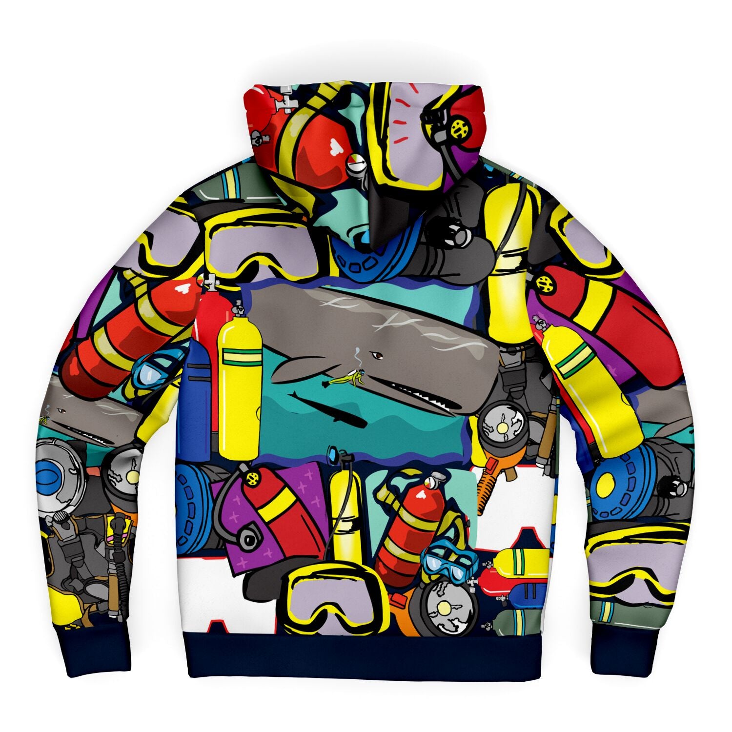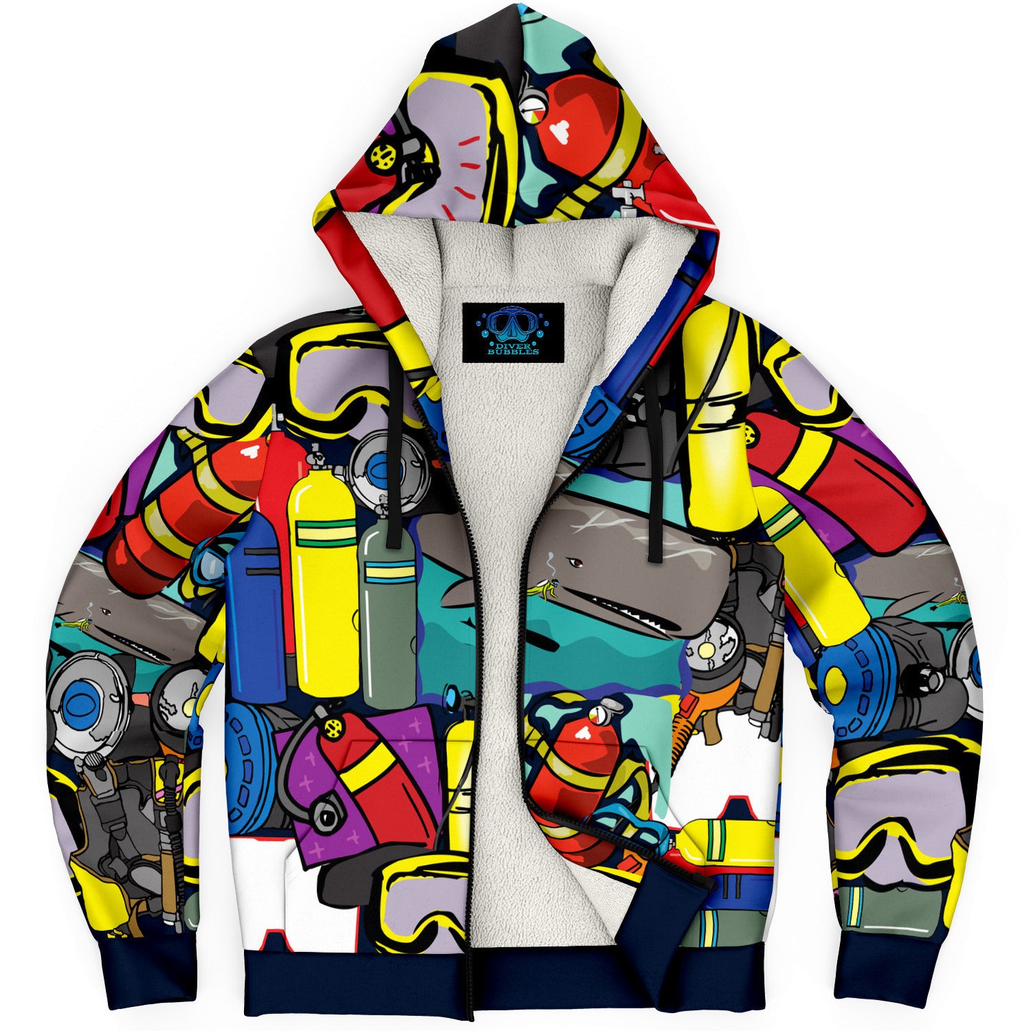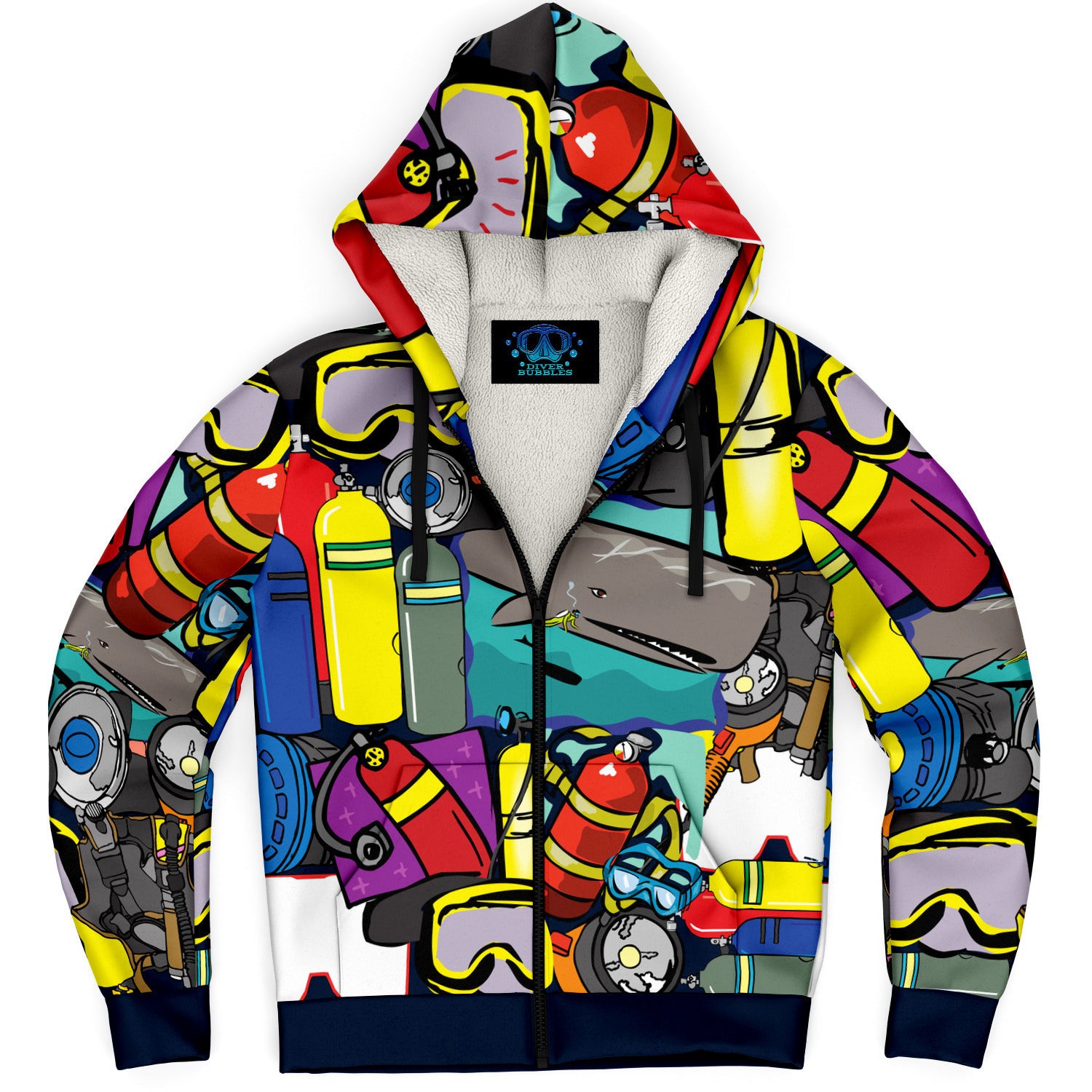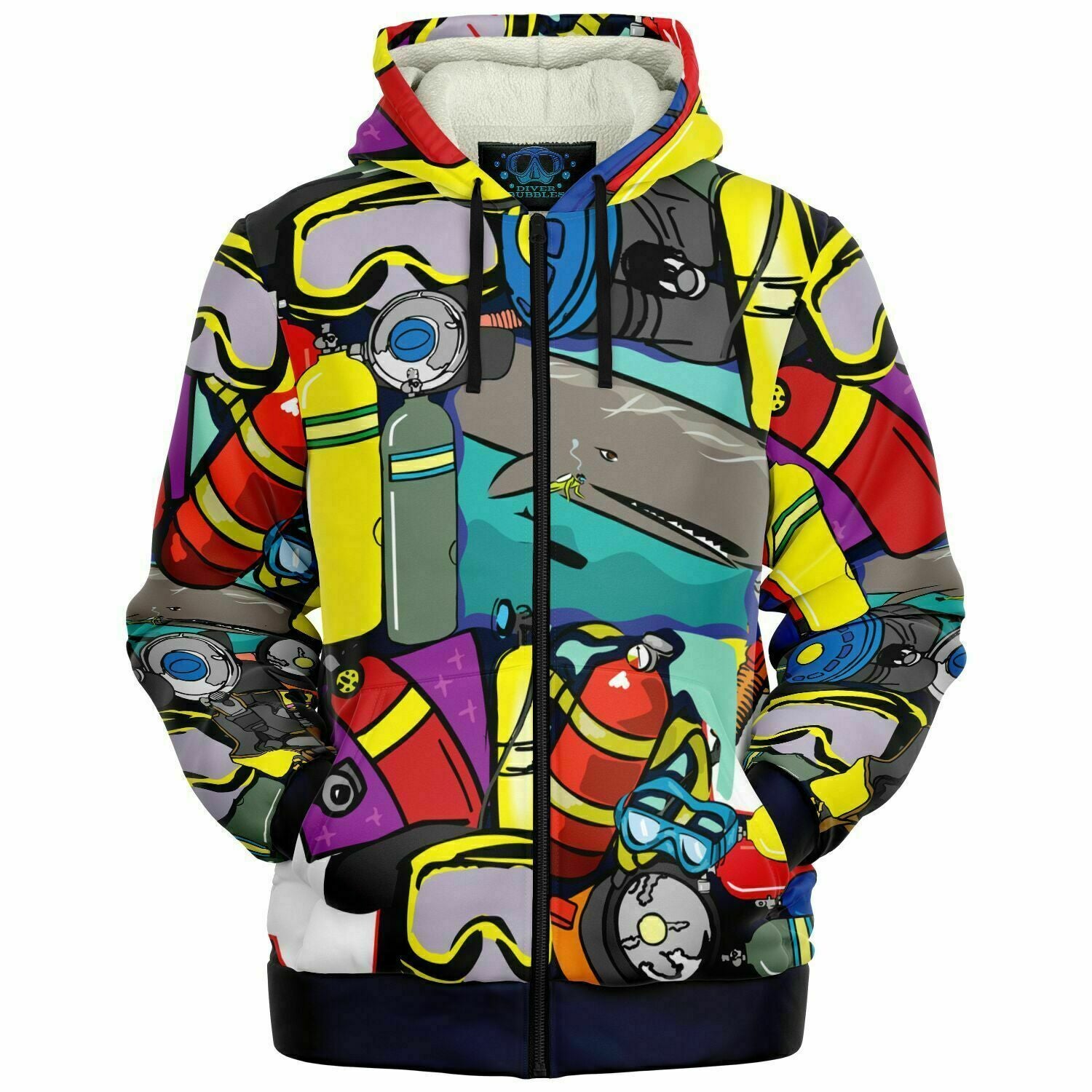 This Pop Art Scuba microfleece zip-up hoodie features a soft and durable fabric. 🟡🔴⚪The microfleece lining on the inside will make this your most comfy zip-up hoodie ever! It also comes with a visible nylon zipper front closure. Each panel is individually printed, cut and sewn to ensure a flawless graphic with no imperfections. 🤿